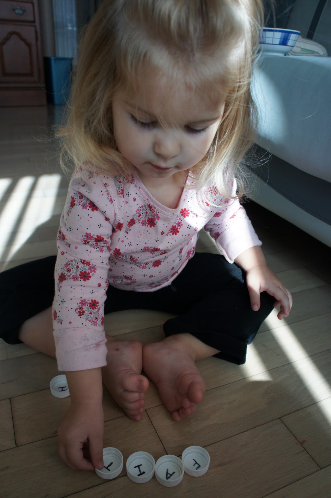 I told her, "Yes! You're name does start with an 'F'!" Then I put the 'F' in the right place and we continued to unscramble them, call them by name and sound them out until we got them in the right order.